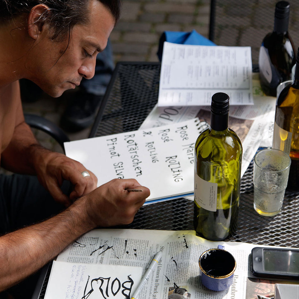 Mit seiner abstrakten Kunst sorgt er für das Design auf den Etiketten der Weine und gibt ihnen somit den letzten Schliff.